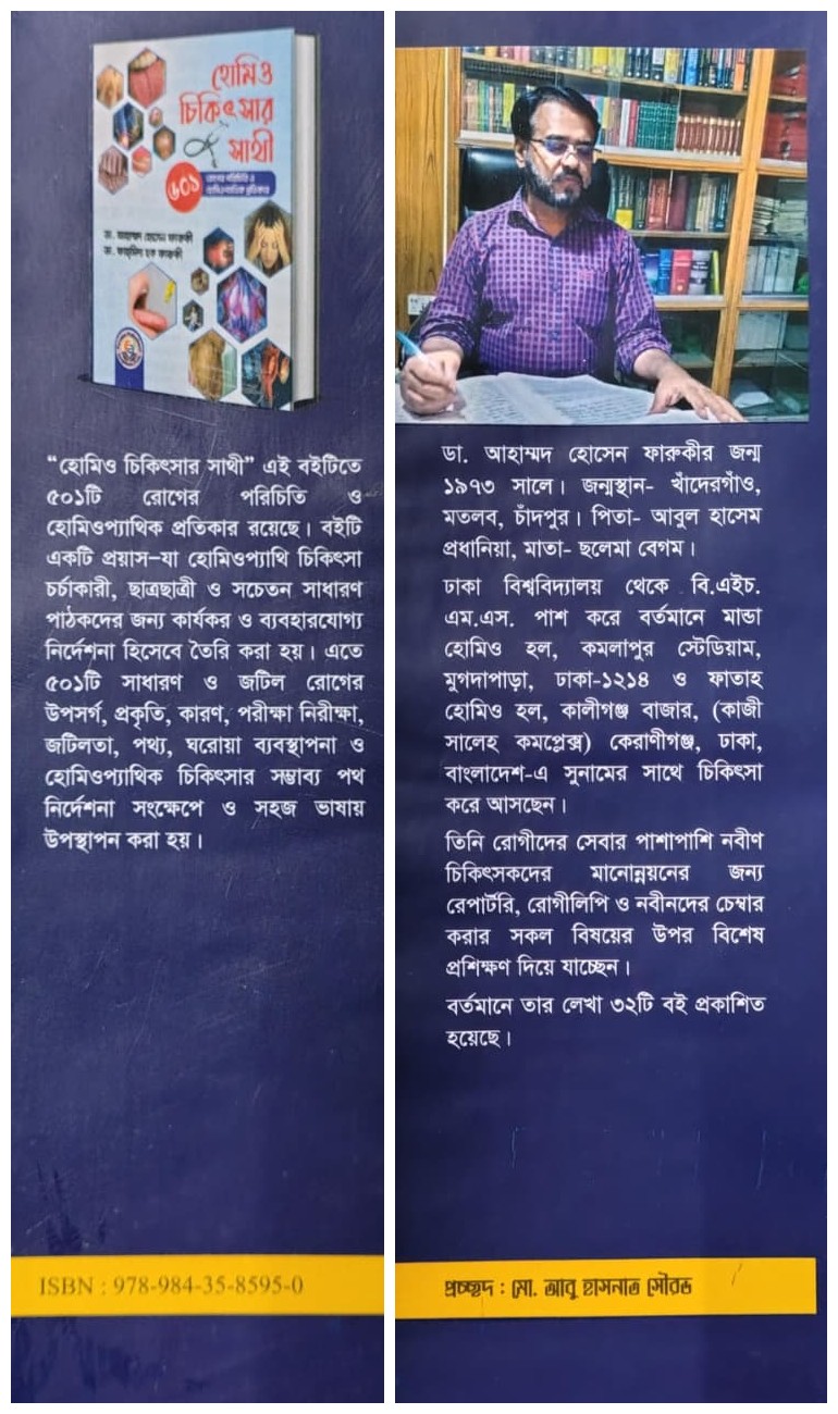 "Homoeo Chikitsar Sathi" is a comprehensive guide to homeopathic treatment, co-authored by Dr. Ahmed Hossain Faruqi and Dr. Fahmida Haque Faruqi. This book serves as an essential companion for both practitioners and enthusiasts seeking reliable homeopathic remedies for everyday health issues. Read more